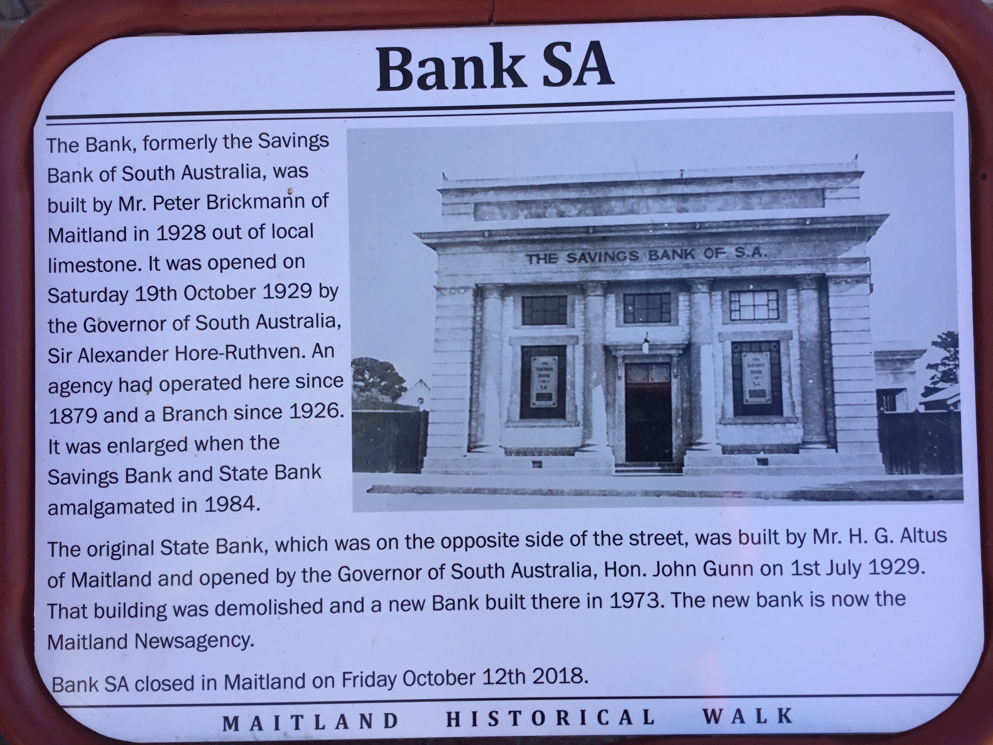BANKSA The former “BankSA” previously the “State Bank of Maitland” has a long serving tradition, providing service to Maitland since 1879.The former “BankSA” used to occupy the former Savings Bank building which was constructed in 1928 with local limestone by Maitland’s, Peter Brickmann. It was enlarged to accommodate the merged bank staff following the 1984 […]